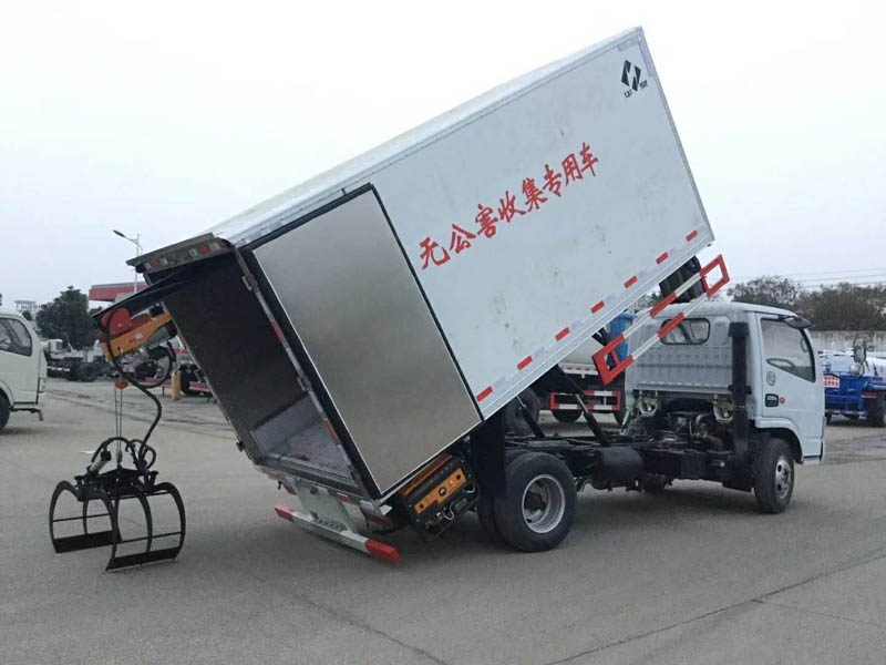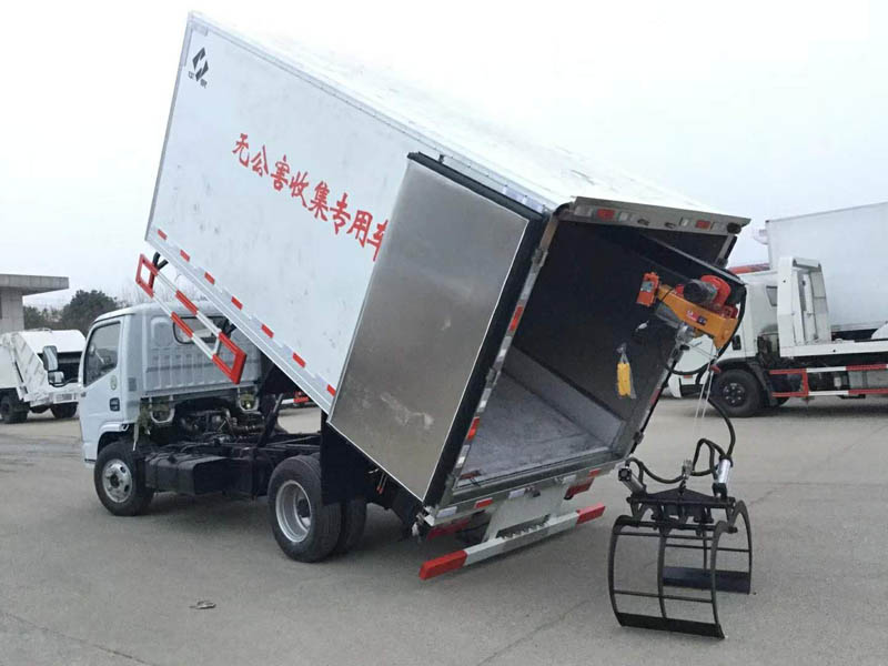 此車優點:無線遙控操作,拖拽病死畜類到收集車廂體,廂體內部有紫外線殺菌燈裝置,消毒噴霧裝置第一時間消毒處理,病死畜類尸液,廢液集中收集,液壓自卸廂體實現病死畜類自然傾卸工作。