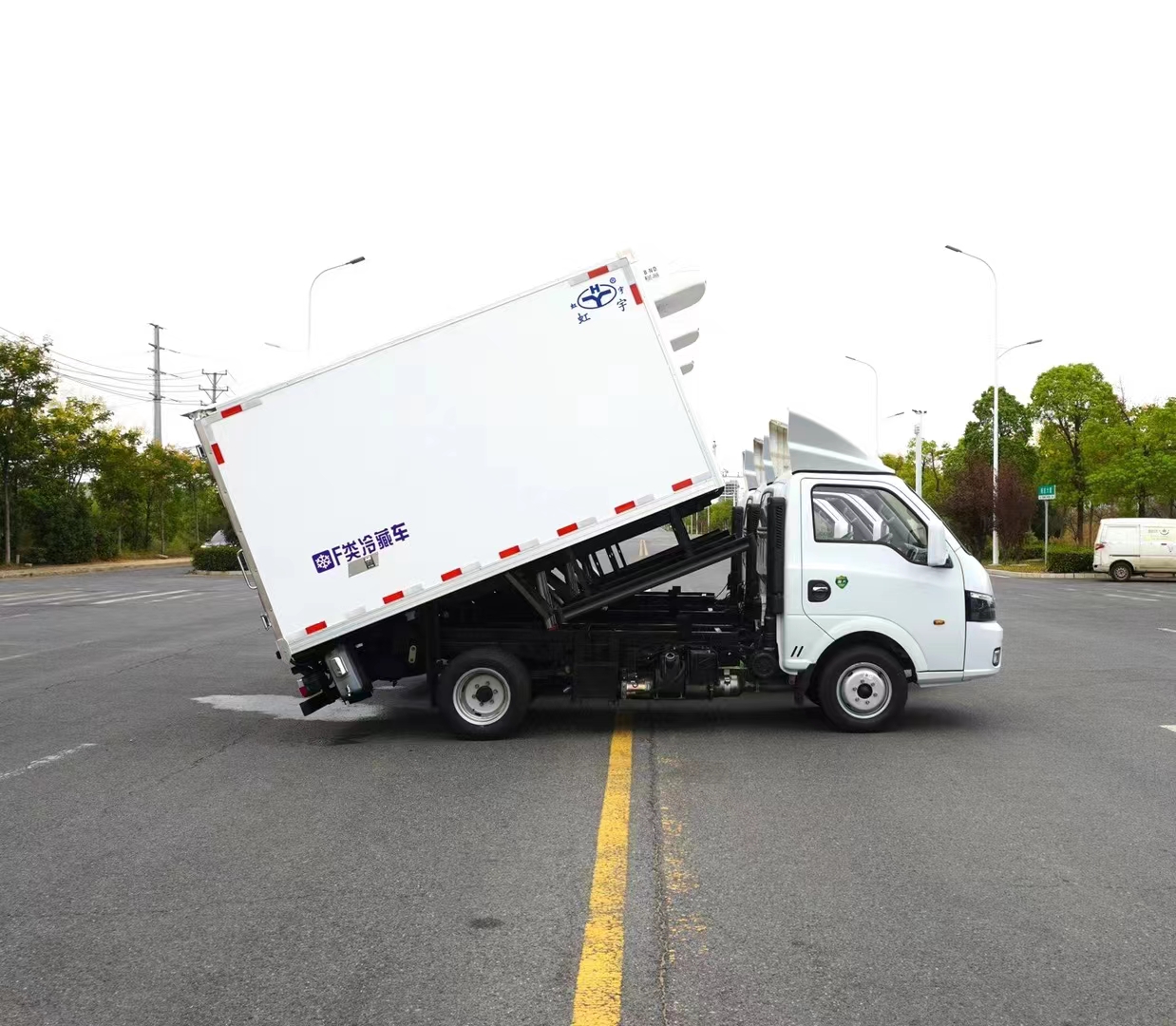 廂體自卸和舉升系統:由液壓缸,翻轉支架組成,安裝于病死豬運輸車上主要用于:病死豬在收到廂體內運輸到處理中心(處理站)后,通過液壓自卸裝置實現病死豬的自動傾卸,省時省力,安全快捷。