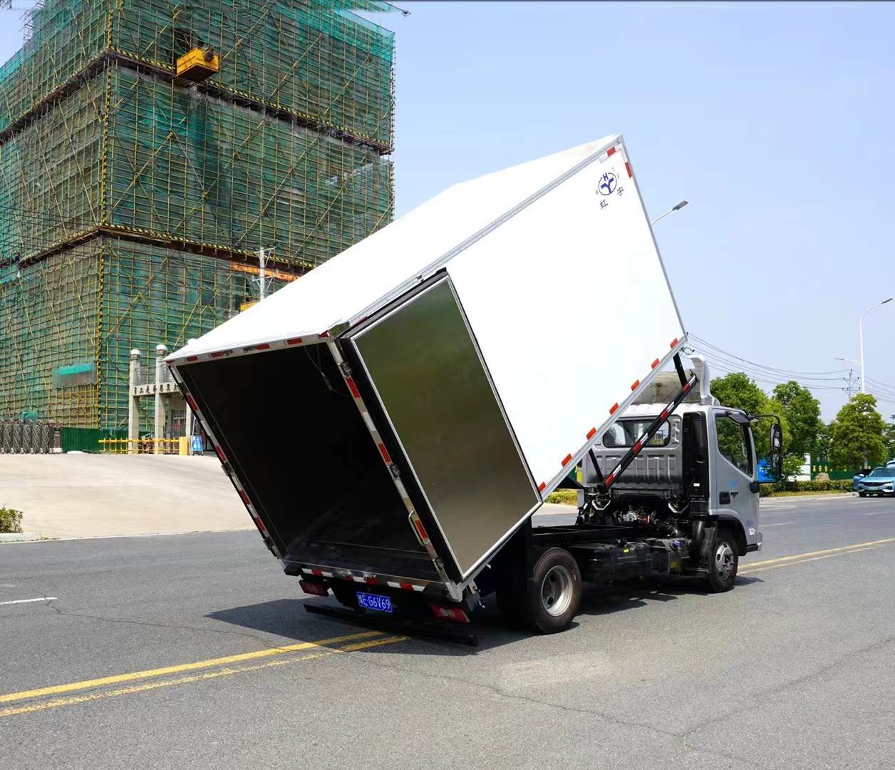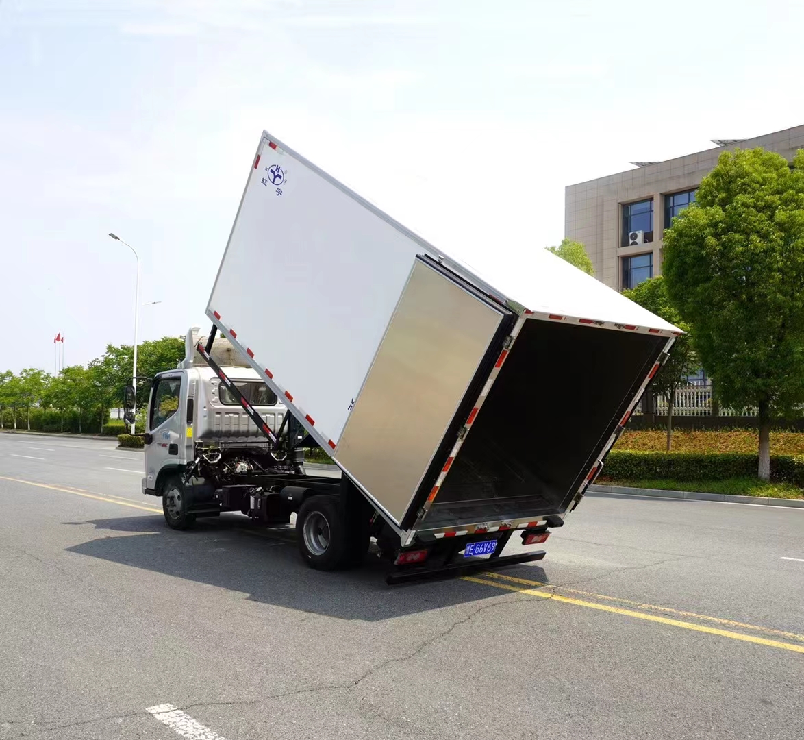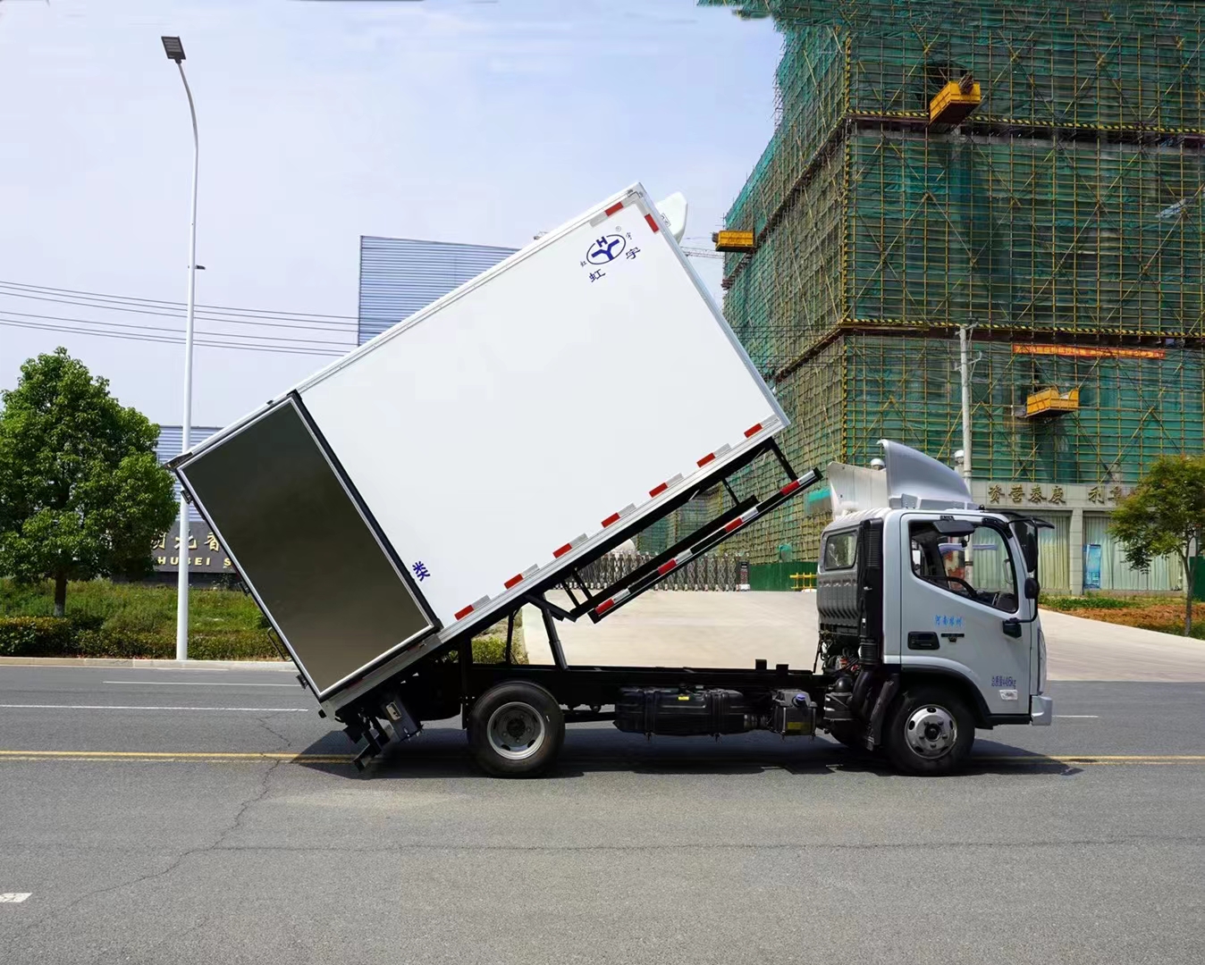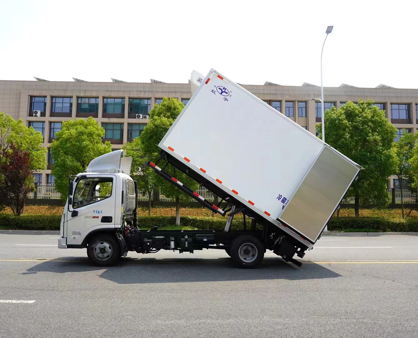 廂體自卸和舉升系統:由液壓缸,翻轉支架組成,安裝于病死豬運輸車上主要用于:病死豬在收到廂體內運輸到處理中心(處理站)后,通過液壓自卸裝置實現病死豬的自動傾卸,省時省力,安全快捷。