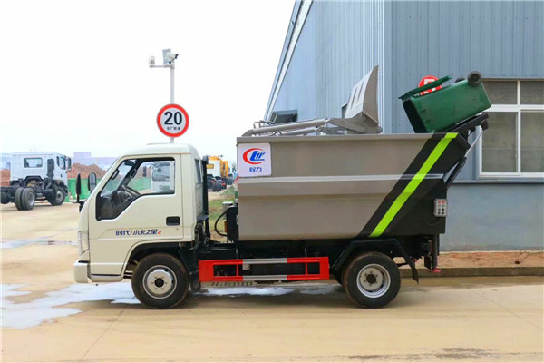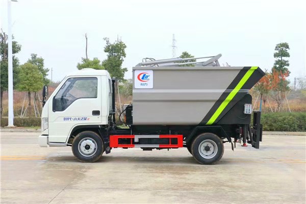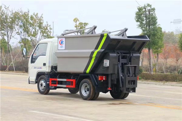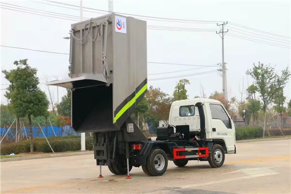 廂體尾部配置國標掛桶提升機,頂部翻轉,頂部加裝液壓刮板壓縮,壓縮比為2.5:1,尾部副梁加裝液壓支腿裝置,雙頂油缸舉升自卸,手電一體操作(可選遙控器)。