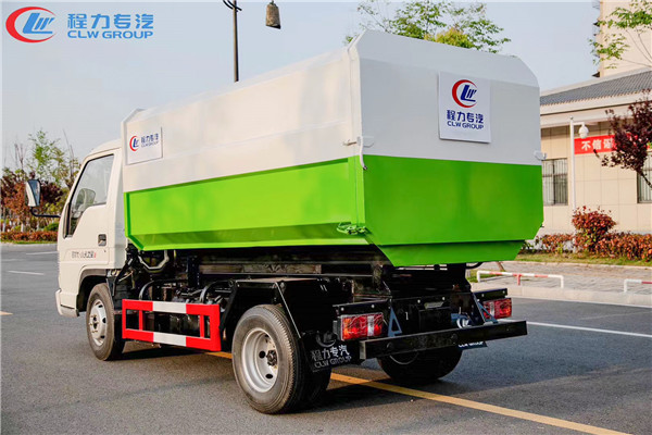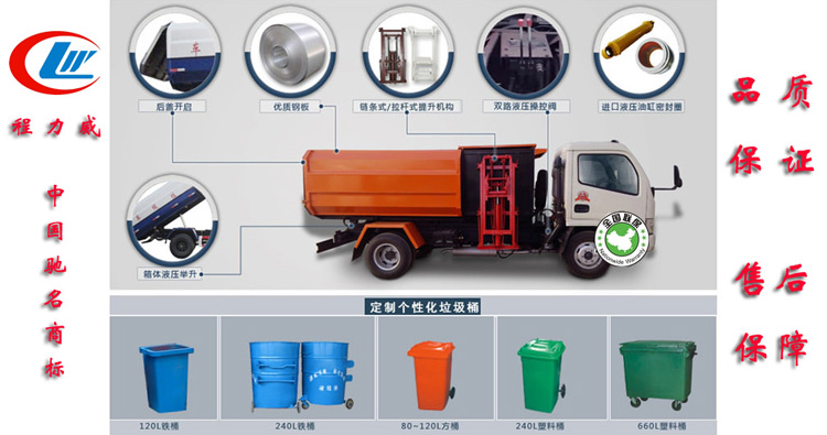 箱體采用邊三底四優質鋼板制作,箱體前部側面帶有掛桶提升機 構,可搭配120升或240升塑料垃圾桶,自動舉升垃圾桶倒入垃圾,提 升機頂部機械翻蓋,箱體底部雙液壓缸舉升自卸,箱體后方設有擋水 槽,尾部裝有橡膠密封條,防污水滴漏。